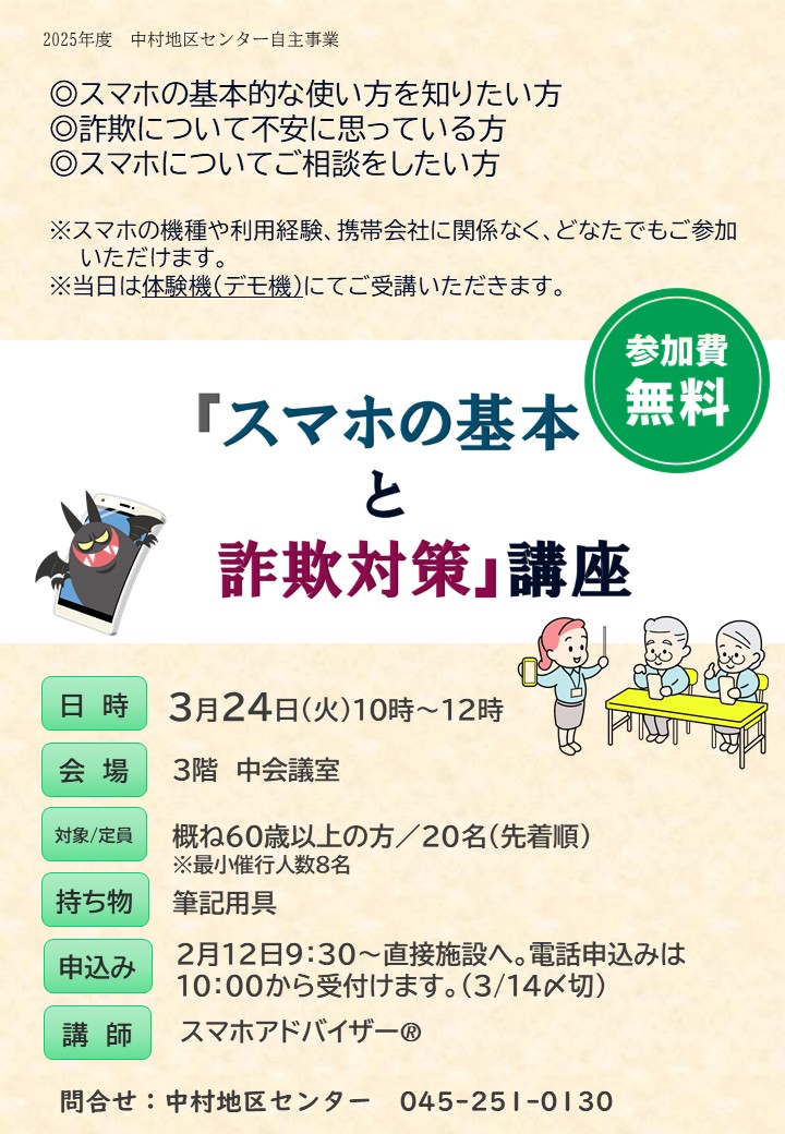 2026年01月26日 【2月募集】スマホの基本と詐欺対策講座 スマホの基本操作と多発している詐欺に遭わないための対策を学びます。貸し出し機器を使って丁寧に教えてくれるので、スマホ操作に自信がない方も安心です。