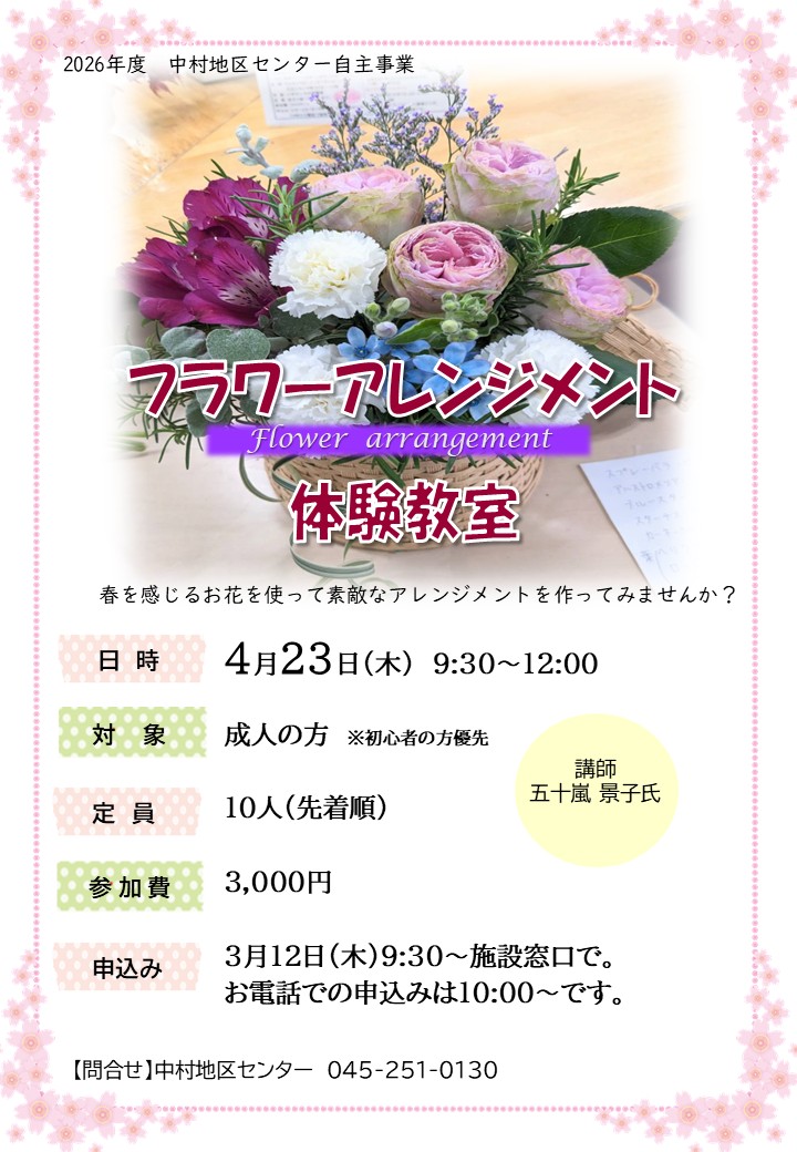2026年02月25日 【3月募集】フラワーアレンジメント体験教室 お花の生け方だけでなくお手入れの仕方やお花の豆知識なども学ぶことができる初心者向けのお教室です。春の生花を贅沢に使ったアレンジメントを作ってみましょう。