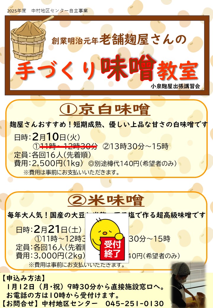 毎年大人気の「高級米味噌」に加え、今年は麹屋さんおススメの「京白味噌」の講習会もあります。